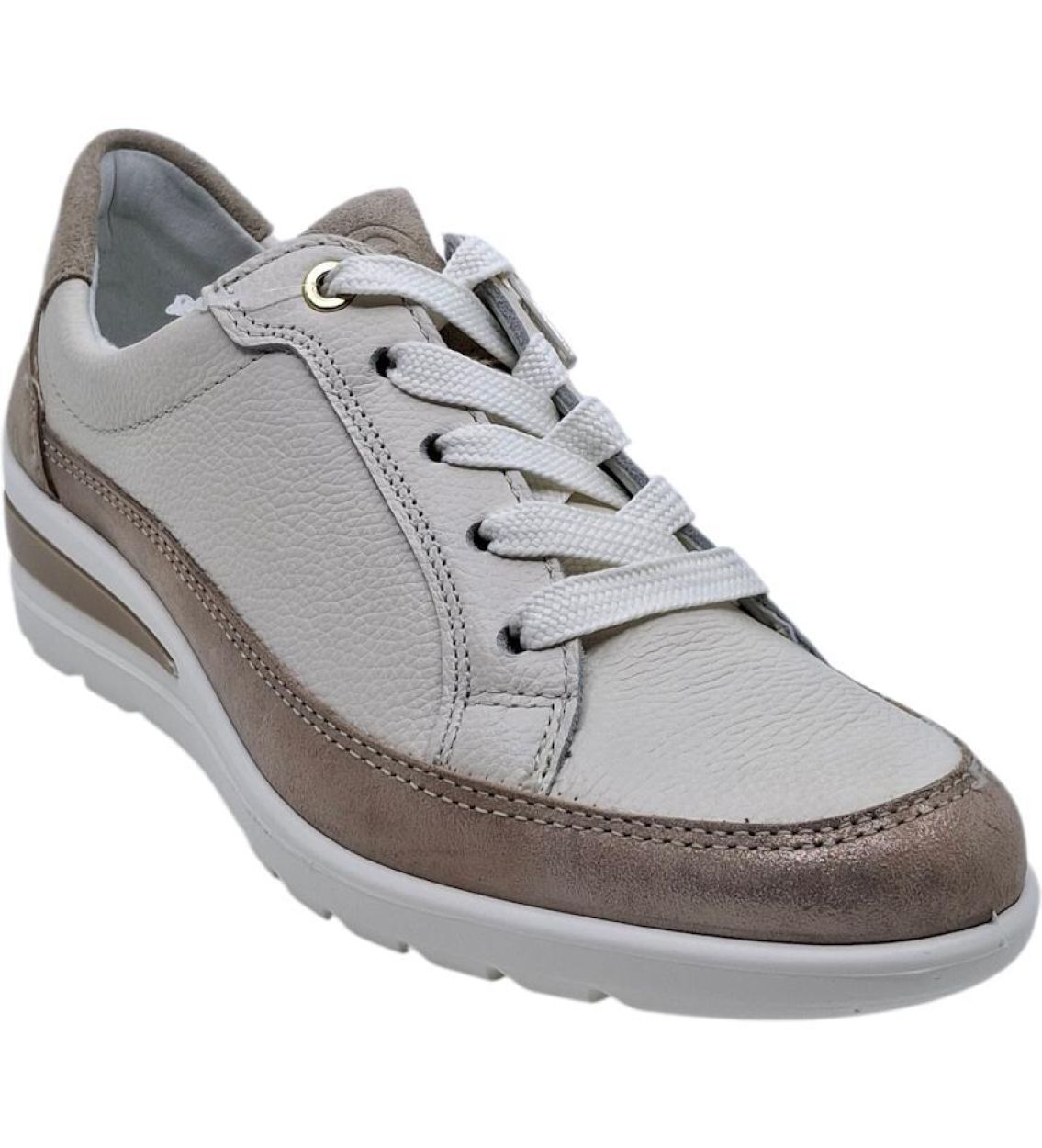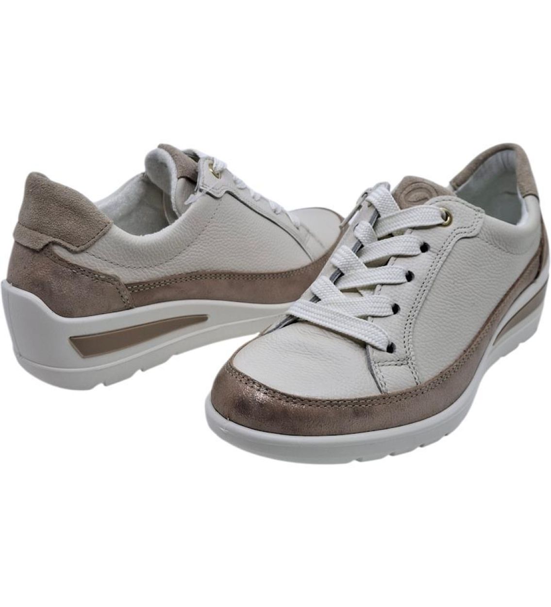 De Ara 12-50601-09 in Cream Beach is een comfortabele en stijlvolle veterschoen met rits en subtiele sleehak. De zachte crèmetint geeft deze schoen een frisse en verzorgde uitstraling die perfect past bij zowel casual als gekledere outfits. Het soepele bovenwerk voelt aangenaam aan en vormt zich mooi naar de voet. Dankzij de combinatie van veters en een praktische rits trek je de schoen eenvoudig aan en uit, terwijl je toch geniet van een perfect verstelbare pasvorm. De lichte sleehak zorgt voor een elegante lift en extra comfort tijdens het stappen. De zachte binnenzool en stabiele zool bieden aangenaam loopcomfort, ook bij langere dagen. Een ideale keuze voor wie comfort, gebruiksgemak en een verfijnde look wil combineren. Soepel en comfortabel bovenwerk Vetersluiting met handige rits Subtiele sleehak Comfortabele binnenzool Lichte en stabiele zool Goede pasvorm Kleur: Cream Beach Model: 12-50601-09