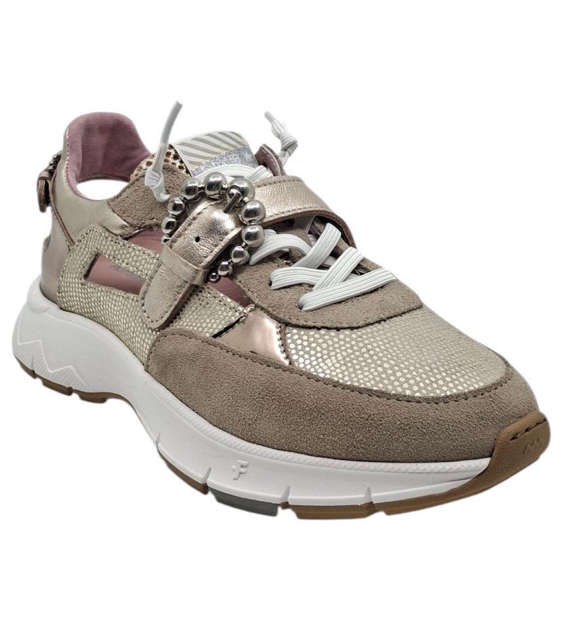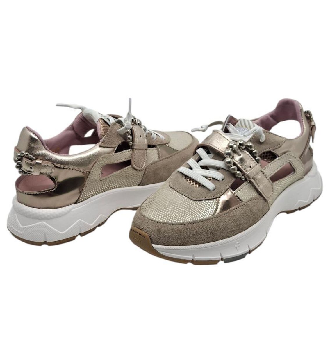 De Floris van Bommel Daysi 08.03 in goud is een elegante en comfortabele damessneaker met een luxueuze uitstraling. De metallic gouden afwerking geeft deze sneaker een stijlvolle en moderne look, die moeiteloos combineert met zowel casual als meer geklede outfits. Het hoogwaardige lederen bovenwerk voelt soepel aan en vormt zich mooi naar de voet. Dankzij de vetersluiting sluit de schoen perfect aan en geniet je van een stabiele en comfortabele pasvorm. De zachte binnenzool biedt aangename demping tijdens het stappen. In combinatie met de lichte en flexibele zool zorgt dit voor een natuurlijk loopgevoel, ook bij langere dagen. Zoals je mag verwachten van Floris van Bommel staat ook dit model voor kwaliteit, vakmanschap en een verzorgde afwerking. Een ideale keuze voor wie comfort wil combineren met een opvallende, elegante uitstraling. Kenmerken Hoogwaardig lederen bovenwerk met metallic afwerking Vetersluiting voor optimale pasvorm Zachte en comfortabele binnenzool Lichte en flexibele zool Goede ondersteuning Modern en vrouwelijk design Kleur: Gold Model: Daysi 08.03 Artikelnummer: 10155-91-01